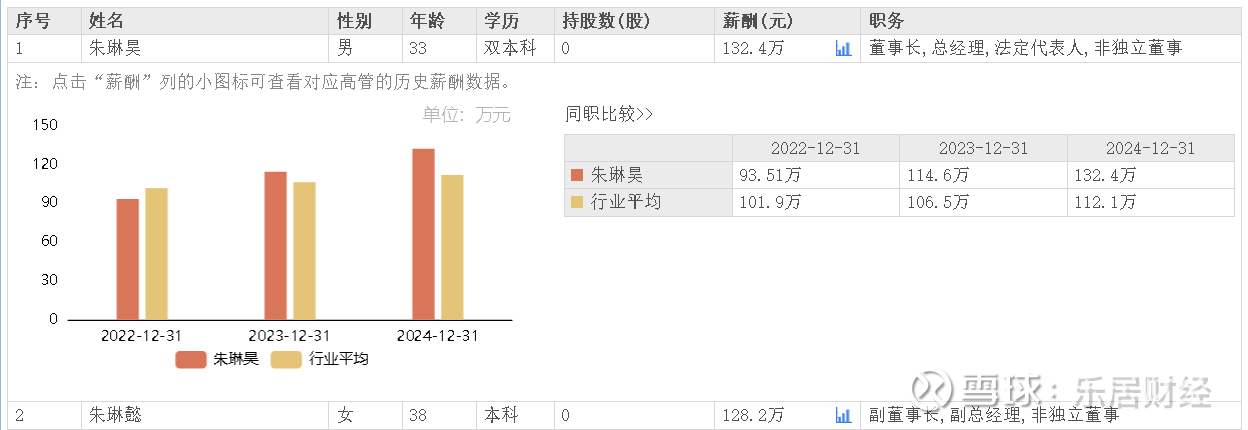 据东方财富网数据,康力电梯董事长兼总经理朱琳昊2024年所获薪酬132.4万元,副董事长、副总经理朱琳懿同年领薪128.2万元。