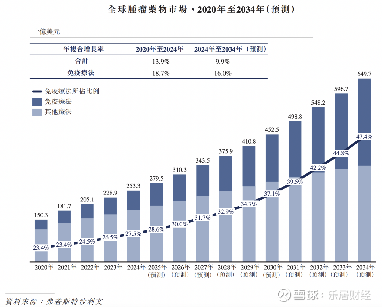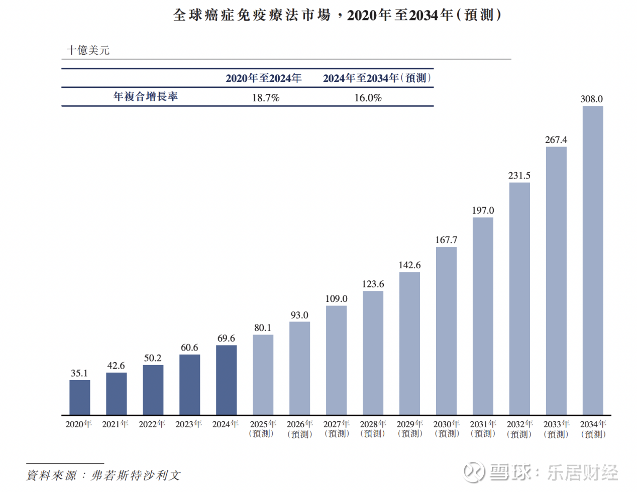 近年来,在新一代疗法获批和适应症不断扩大的推动下,全球癌症免疫疗法市场稳步增长,从2020年的351亿美元增至2024年的696亿美元,年复合增长率为18.7%。预计2024年至2034年间将保持16.0%的年复合增长率,市场规模将达3,080亿美元。下图展示全球癌症免疫疗法市场增长趋势。