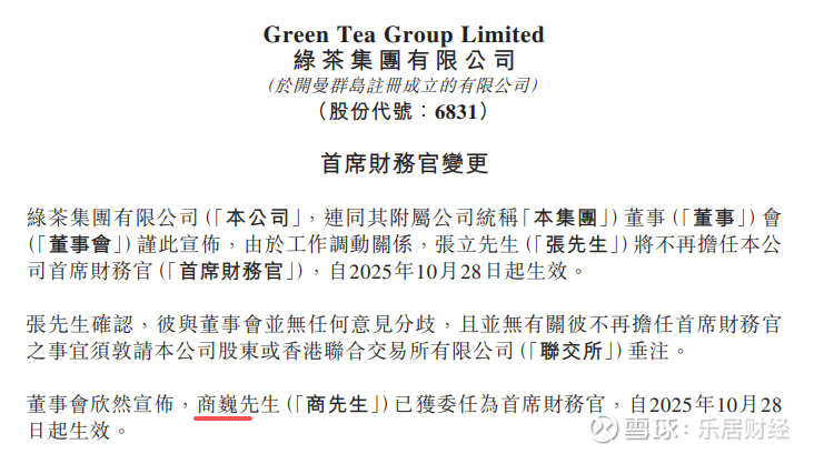 瑞财经 张林霞11月2日,绿茶集团(06831.HK)发布公告,商巍已获委任为首席财务官,自2025年10月28 日起生效。