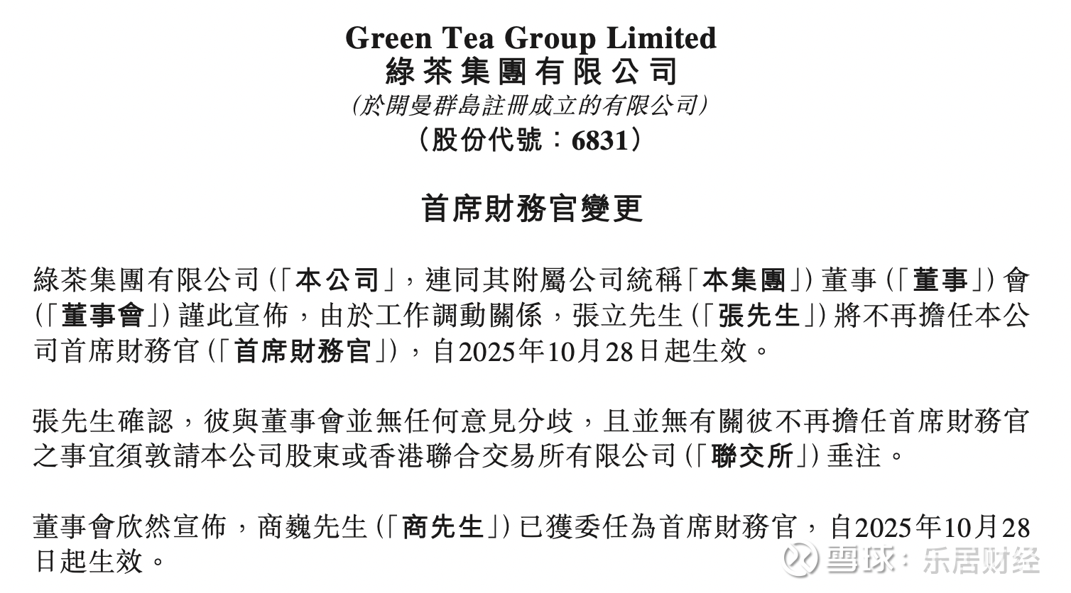 瑞财经 吴文婷 近日,绿茶集团发布公告称,由于工作调动关系,张立将不再担任公司首席财务官,自2025年10月28日起生效。