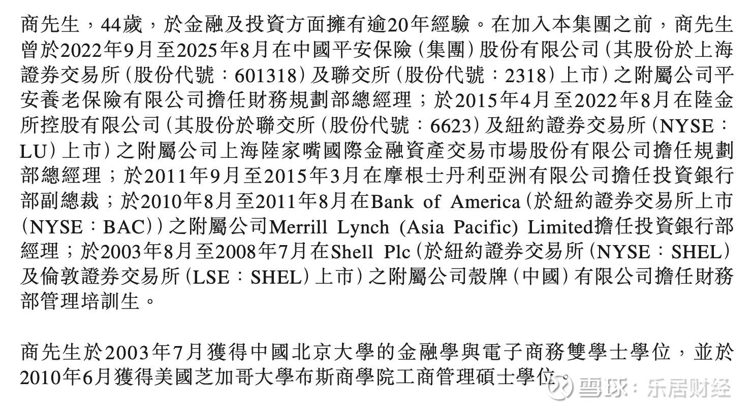 资料显示,商巍,44岁,于金融及投资方面拥有逾20年经验。在加入集团之前,商巍曾于2022年9月至2025年8月在中国平安保险(集团)股份有限公司(其股份于上证券交易所(股份代号:601318)及联交所(股份代号:2318)上市)之附属公司平安养老保险有限公司担任财务规划部总经理;于2015年4月至2022年8月在陆金所控股有限公司(其股份于联交所(股份代号:6623)及纽约证券交易所(NYSE:LU)上市)之附属公司上海陆家嘴国际金融资产交易市场股份有限公司担任规划部总经理;于2011年9月至2015年3月在摩根士丹利亚洲有限公司担任投资银行部副总裁;于2010年8月至2011年8月在Bank of America(于纽约证券交易所上市(NYSE:BAC))之附属公司Merrill Lynch (Asia Pacific) Limited担任投资银行部经理;于2003年8月至2008年7月在Shell Plc(于纽约证券交易所(NYSE:SHEL)及伦敦证券交易所(LSE:SHEL)上市)之附属公司壳牌(中国)有限公司担任财务部管理培训生。
