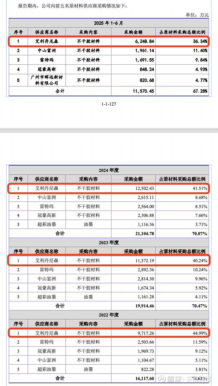 值得注意的是,2022年-2025上半年,艾利丹尼森均为公司第一大供应商,采购占比分别为44.99%、40.24%、41.51%、36.34%。
