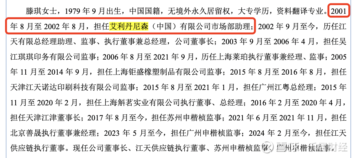 而滕琪、黄延国都曾在艾利丹尼森中任职。2001年8月至2002年8月,滕琪曾担任艾利丹尼森(中国)有限公司市场部助理;1999年11月至2002年9月,黄延国曾担任艾利丹尼森(中国)有限公司市场部主管。