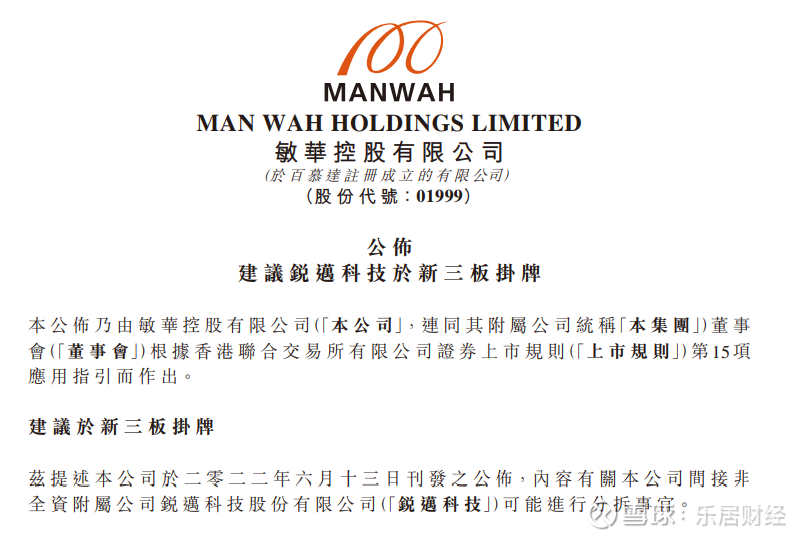 乐居财经 李兰 近日,敏华控股(01999.HK)发布公告,公司间接非全资附属公司锐迈科技股份有限公司(以下简称“锐迈科技”)已向全国股转公司提交申请,拟于新三板独立挂牌交易,并获全国股转公司受理。
