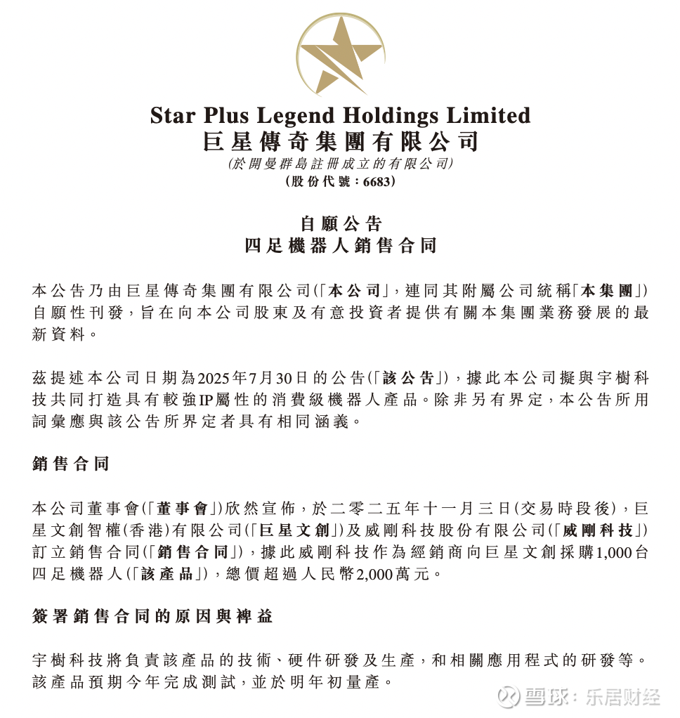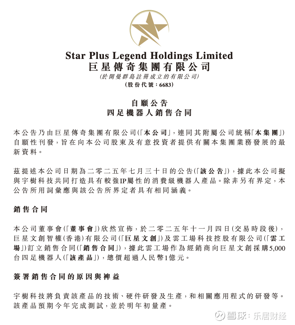 瑞财经 吴文婷 11月5日,巨星传奇发布公告称,于2025年11月4日(交易时段后),巨星文创智权(香港)有限公司(以下简称“巨星文创”)及云工场科技控股有限公司(以下简称“云工场”)订立销售合同,据此云工场作为经销商向巨星文创采购5,000台四足机器人,总价超过1亿元。