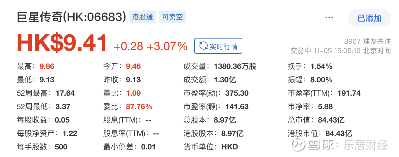 截至发稿时,巨星传奇报9.41港元,涨3.07%,总市值约84.43亿港元。