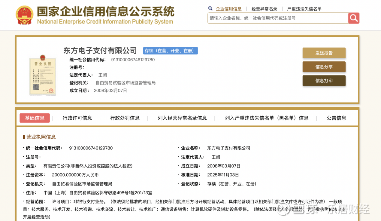 央行官网显示,东方支付支付牌照于2024年8月续展,获许开展互联网支付等业务。