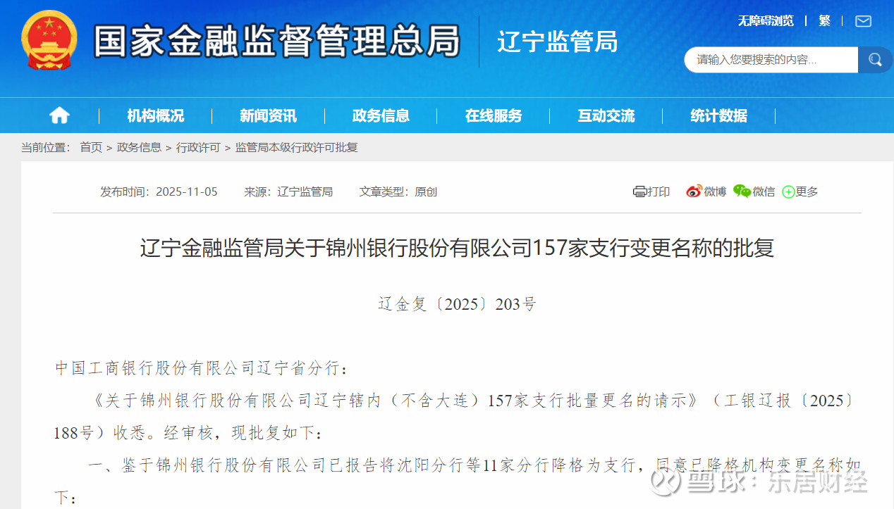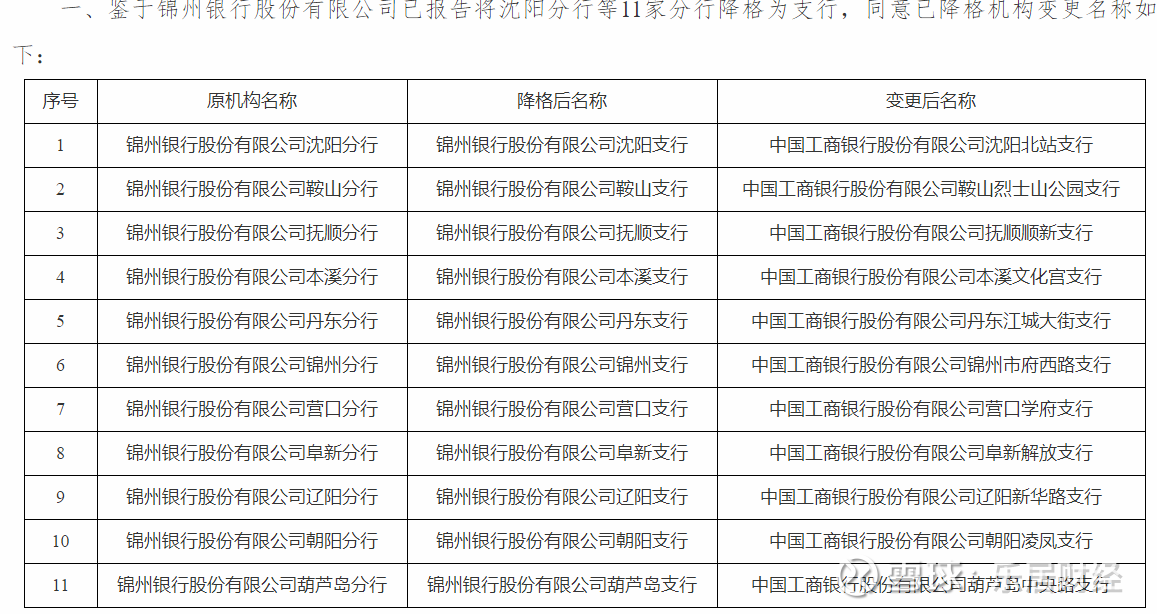 瑞财经 王敏11月6日,辽宁金融监管局发布《关于锦州银行股份有限公司157家支行变更名称的批复》。其中,锦州银行已报告将沈阳分行等11家分行降格为支行,与其余146家原锦州银行支行共同更名为工商银行支行。