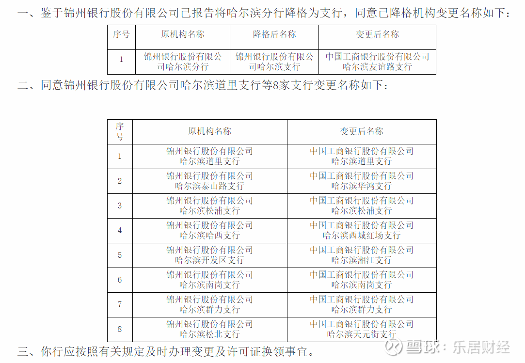 国家金融监督管理总局黑龙江监管局发布《关于锦州银行股份有限公司9家支行变更名称的批复》。其中,哈尔滨分行已报告降格为支行,变更后名称为“中国工商银行股份有限公司哈尔滨友谊路支行”,其余8家原支行变更为工商银行支行。