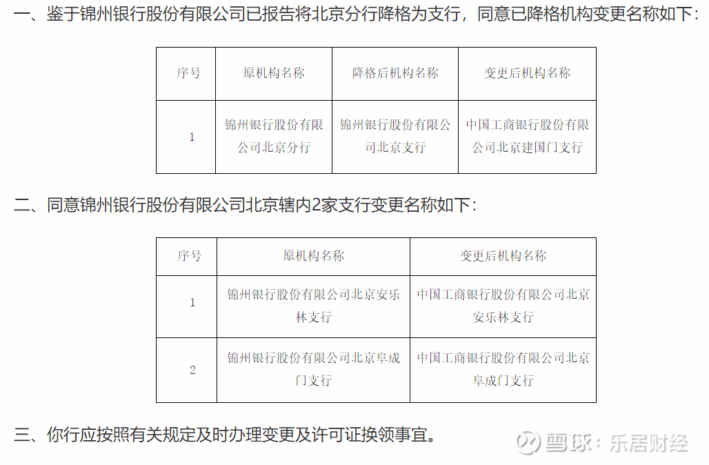 北京金融监管局发布《关于锦州银行股份有限公司3家支行变更名称的批复》。其中 ,北京分行已被报告降格为支行,变更后名称为“中国工商银行股份有限公司北京建国门支行”,其余2家原支行变更为工商银行支行。