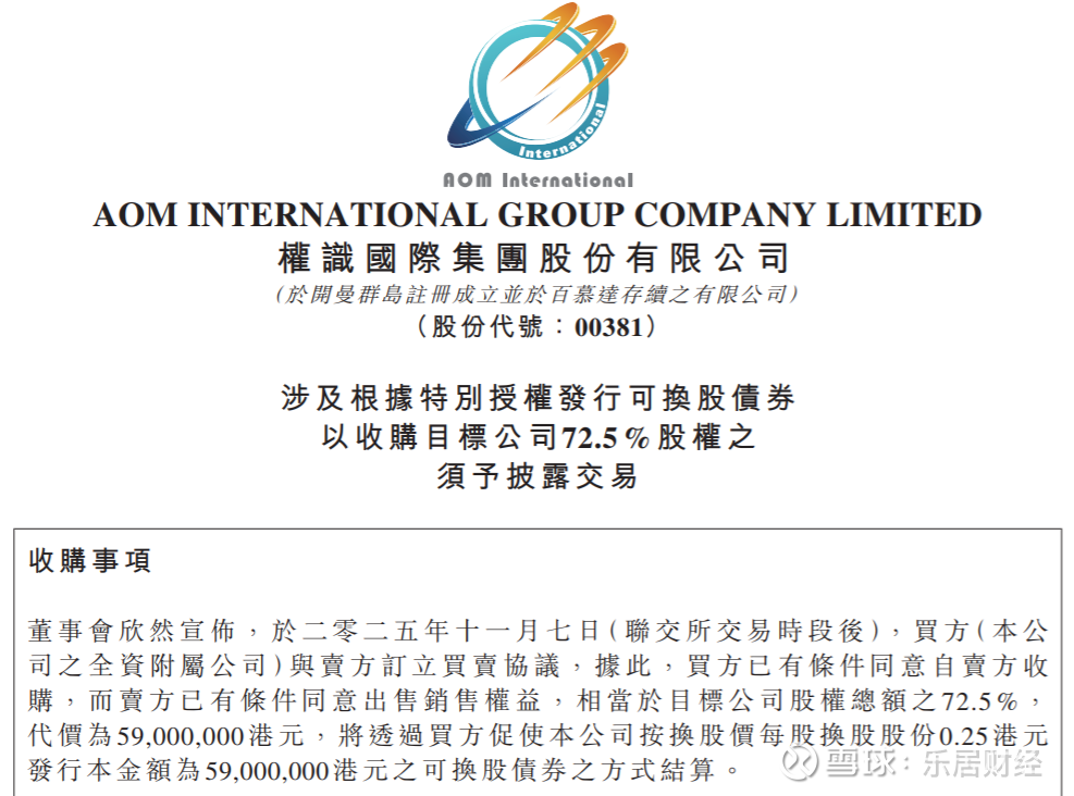 代价5900万港元,将通过发行三年期零息可换股债券支付,换股价0.25港元,较周五(11月7日)收市价溢价0.81%。