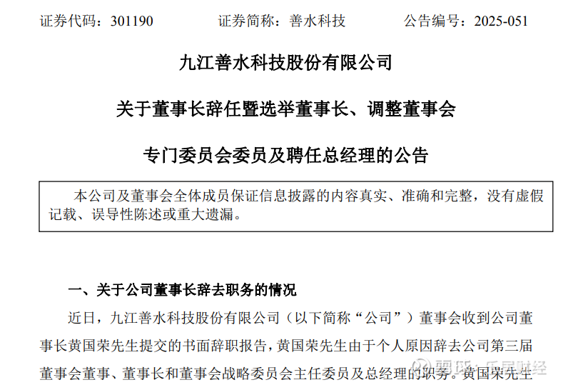 公告显示,善水科技公司董事会近日收到董事长黄国荣的书面辞职报告,其因个人原因辞去第三届董事会董事、董事长、董事会战略委员会主任委员及总经理职务,原定任期至2025年12月5日。黄国荣辞任后不再担任公司及控股子公司任何职务,截至公告披露日,其持有公司股份40000000股,占总股本的18.6362%,辞职后仍将遵守相关减持规定。
