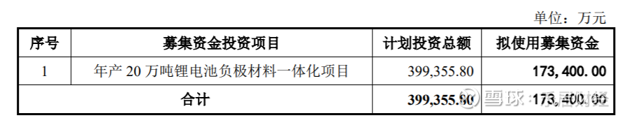 据悉,本次拟向不特定对象发行可转换公司债券募集资金总额不超过17.34亿元(含本数),扣除发行费用后,用于年产20万吨锂电池负极材料一体化项目。
