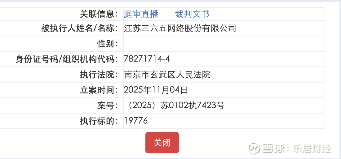 瑞财经 严明会 近日,江苏三六五网络股份有限公司被列入被执行人,案号为(2025)苏0102执7423号,执行标的为19776元,执行法院为江苏省南京市玄武区人民法院,立案日期为2025-11-04。