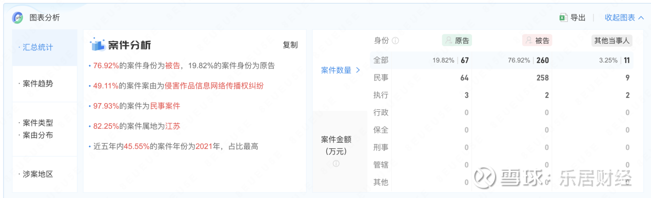 据天眼查,江苏三六五网络股份有限公司共涉及司法案件338件,其中,76.92%的案件身份为被告,19.82%的案件身份为原告,49.11%的案件案由为侵害作品信息网络传播权纠纷,97.93%的案件为民事案件。
