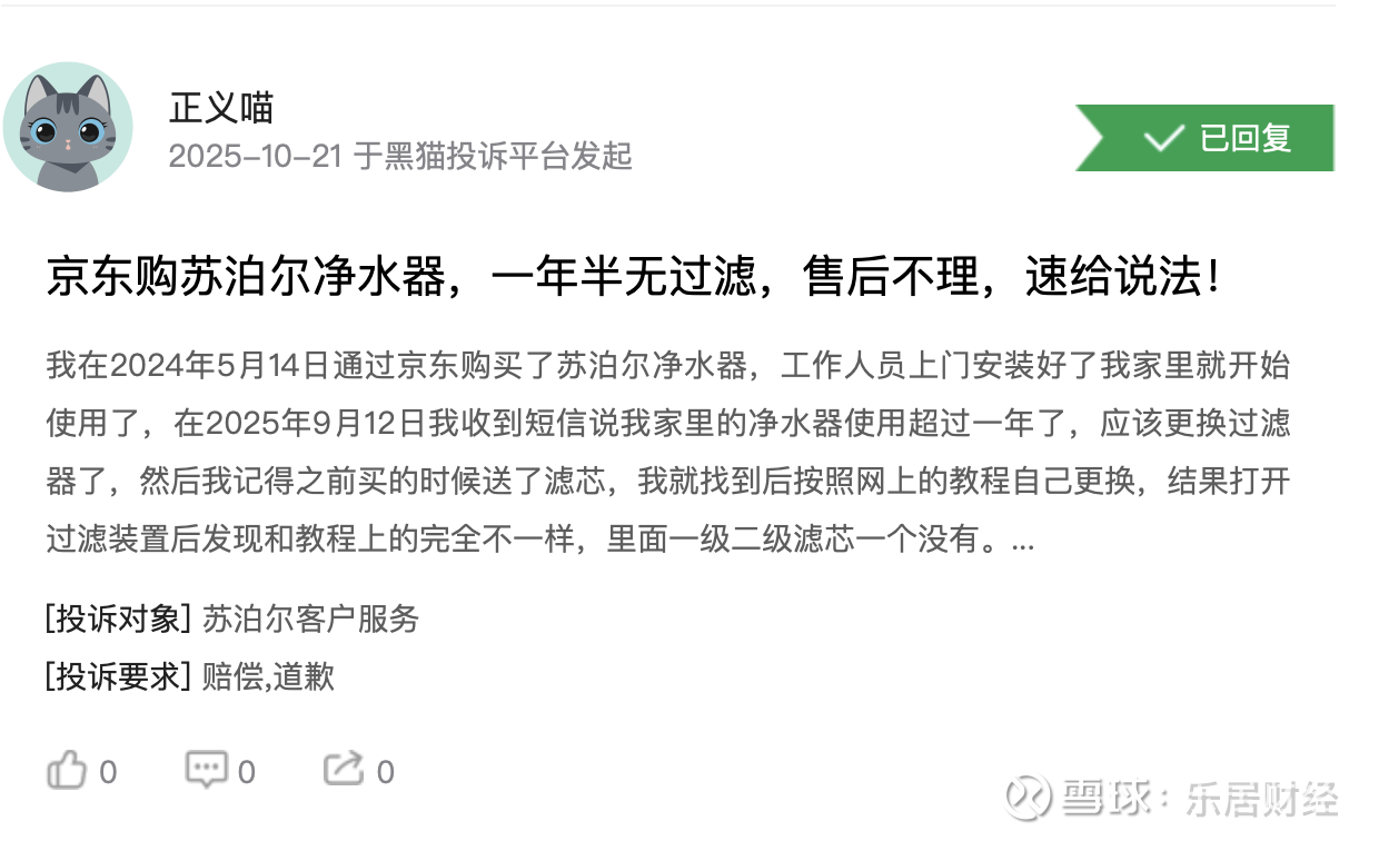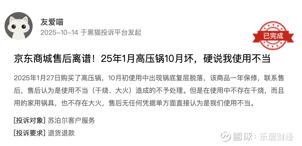 雪上加霜的是产品质量引发的信任危机。在黑猫投诉等平台,苏泊尔的质量与售后投诉量显著高于同行,从炊具涂层脱落、不锈钢锰含量超标,到小家电电源线强度不足,问题五花八门。2025年以来,燃气灶具玻璃面板自爆、以次充好等投诉仍时有发生,虽多以和解收场,但持续消耗着“国民品牌”的信誉积淀。
