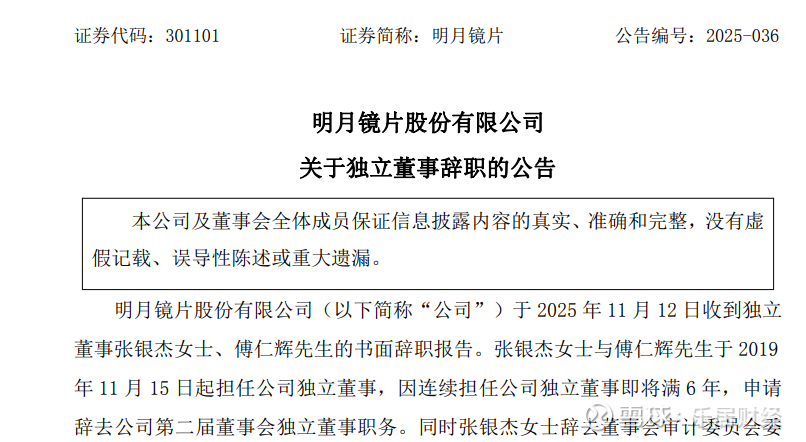 瑞财经 钟鸣辰 11月12日晚,明月镜片(SZ301101)发布人事变动公告,宣布独立董事张银杰、傅仁辉请辞。