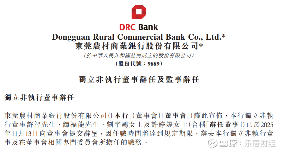 瑞财经 王敏11月13日,东莞农村商业银行股份有限公司(以下简称“东莞农商银行”)发布公告,披露多项董监人员变动事宜,包括四位独立非执行董事及一位监事长的辞任。