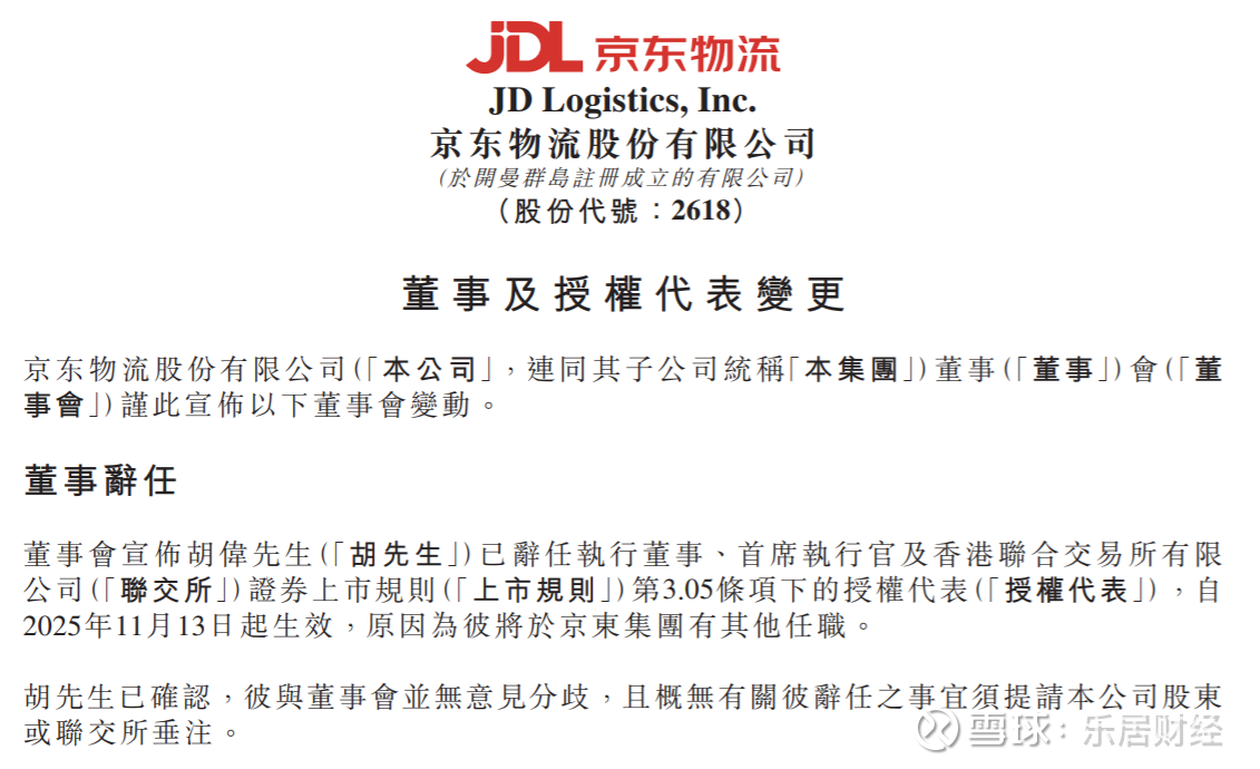 瑞财经 王敏11月13日,京东物流(02618)发布公告,董事会宣布胡伟已辞任执行董事、首席执行官,自2025年11月13日起生效,原因为其将于京东集团有其他任职。