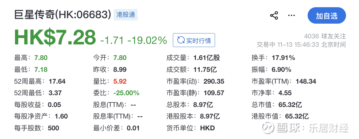 截至发稿,巨星传奇股价跌19.02%,报7.28港元,总市值为65.32亿港元。