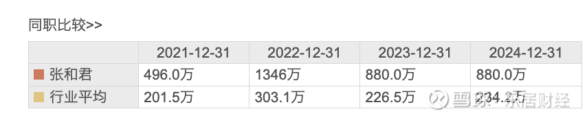 东方财富数据显示,2021年至2024年,张和君薪酬分别为496万元、1346万元、880万元、880万元。