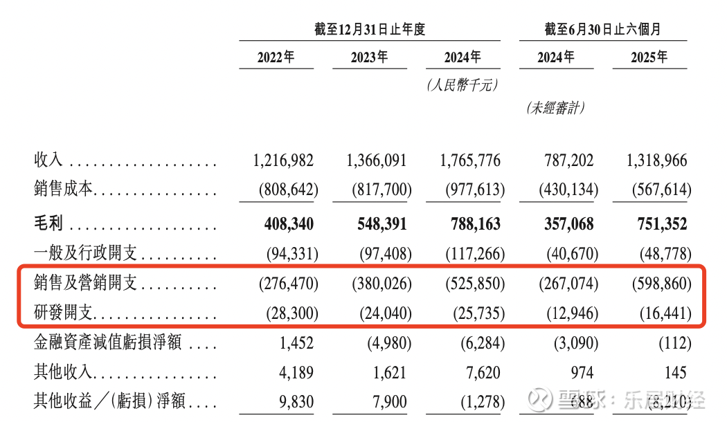 2022年-2024年及2025上半年,若羽臣的销售及营销开支分别为2.76亿元、3.8亿元、5.26亿元、5.99亿元。而其研发投入金额相对稳定,分别为2830万元、2404万元、2573.5万元,1644.1万元。可见,上半年其营销开支是研发费用约30倍。