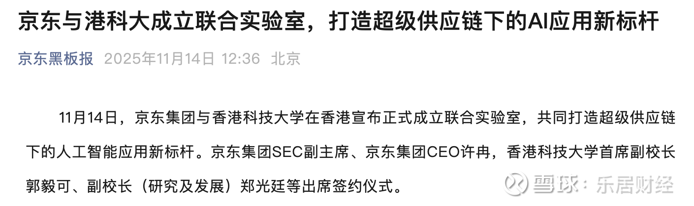瑞财经 吴文婷 11月14日,据京东黑板报,京东集团与香港科技大学宣布正式成立联合实验室,共同打造超级供应链下的人工智能应用新标杆。