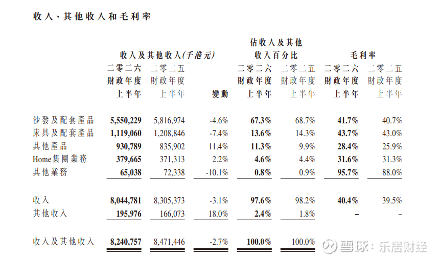 从产品来看,沙发及配套产品收入55.5亿港元,同比下降4.6%;床具及配套产品同比下降7.4%至11.19亿港元。其他产品收入增长11.4%,达到9.31亿港元。Home 集团业务收入为3.8亿港元,同比增长2.2%。