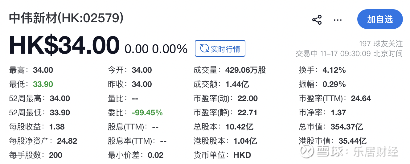 乐居财经 吴文婷 11月17日,中伟新材(02579.HK)在港交所挂牌上市,联席保荐人为华泰国际、摩根士丹利。其股价平开报34港元,总市值约354.37亿港元。
