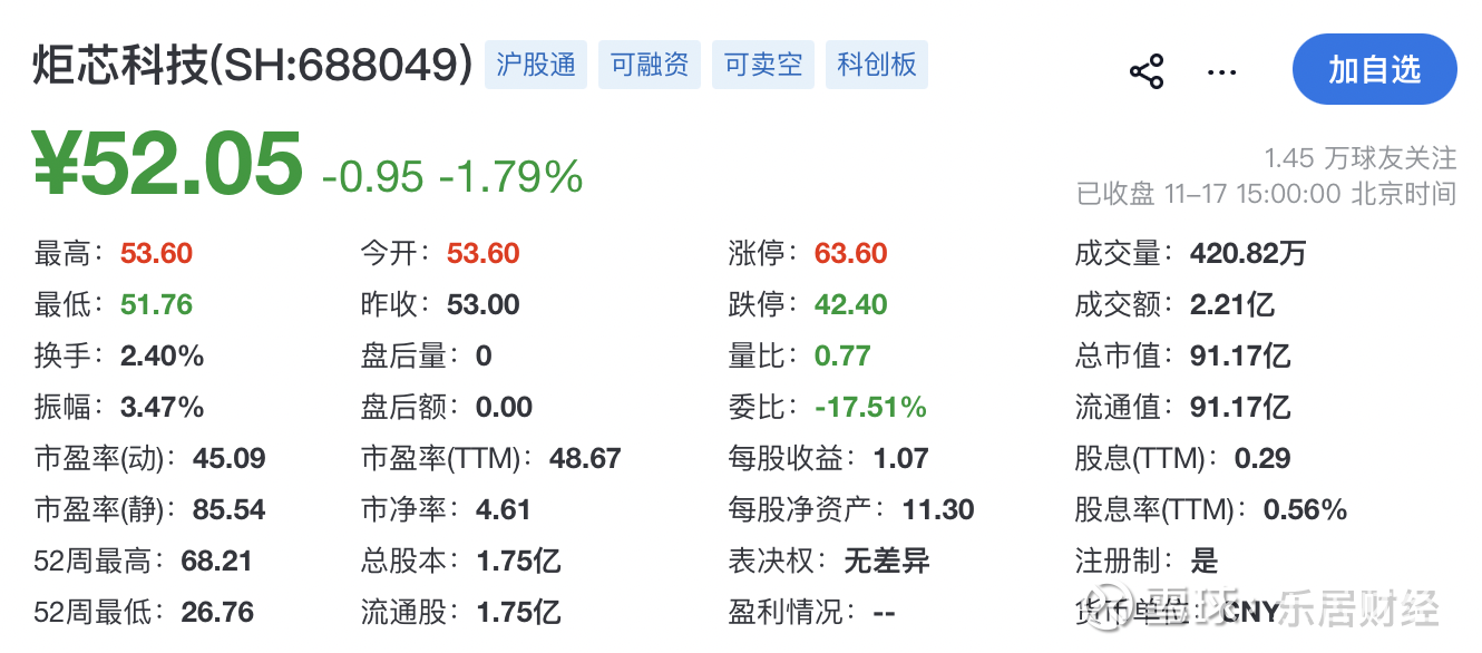 截至发稿时,炬芯科技A股报52.05元,跌1.79%,总市值约91.17亿元。