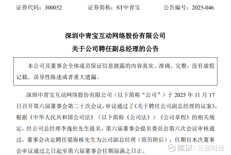 公告显示,中青宝当日召开第六届董事会第二十次会议,审议通过《关于聘任公司副总经理的议案》。经公司总经理李逸伦提名,第六届董事会提名委员会第六次会议审核通过,董事会决定聘任梁海栋为公司副总经理,任期自本次董事会审议通过之日起至第六届董事会任期届满之日止。
