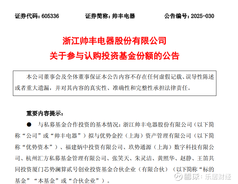据公告,帅丰电器拟与优势金控(上海)资产管理有限公司、福建炳中投资有限公司、玖势通源(上海)数字科技有限公司、杭州汇方私募基金管理有限公司、张笑天、朱灵洁、黄照华、赵静、王笛共同投资厦门芯势澜算贰号创业投资基金合伙企业(有限合伙)。
