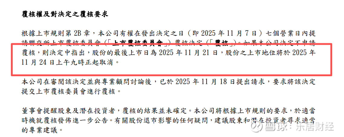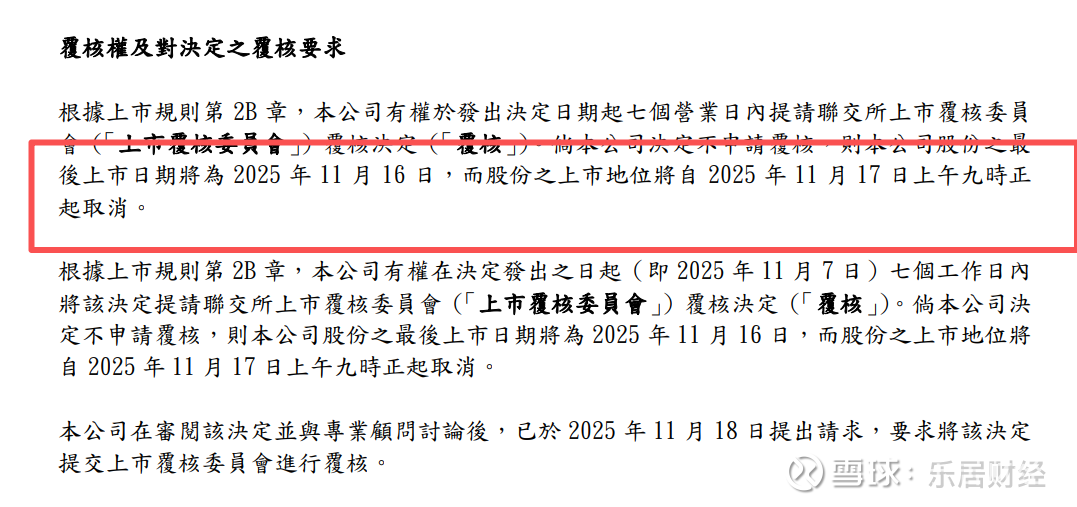 据公告,依据上市规则第2B章,集一控股有权在2025年11月7日决定发出后的七个营业日内,向联交所上市复核委员会提请复核。若未申请复核,股份最后上市日将为2025年11月21日,上市地位于11月24日上午9时正式取消。