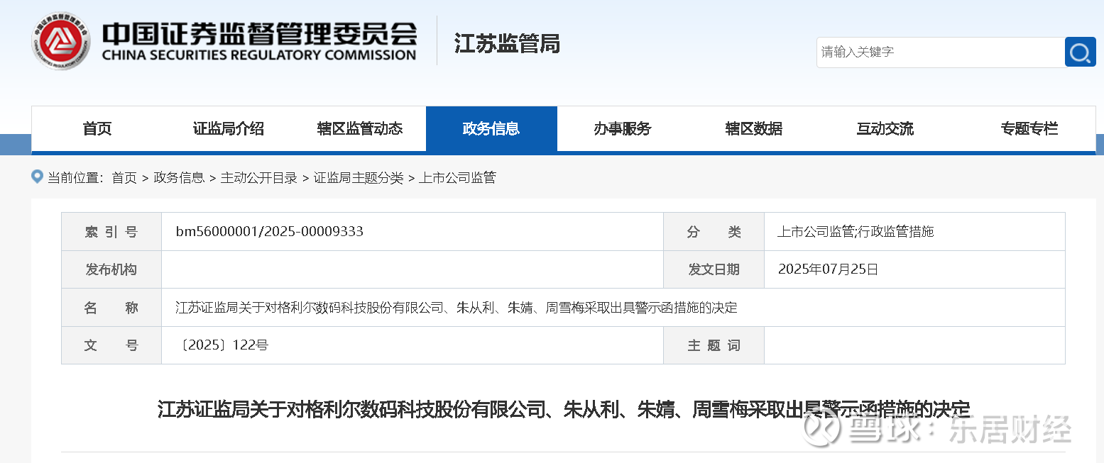 据证监委江苏监管局官网7月25日公告,格利尔因公司2024年业绩快报与实际业绩差异较大,业绩快报信息披露不准确且未披露修正公告,决定对格利尔及公司董事长朱从利、总经理朱婧、财务总监兼董事会秘书周雪梅采取出具警示函的行政监管措施。