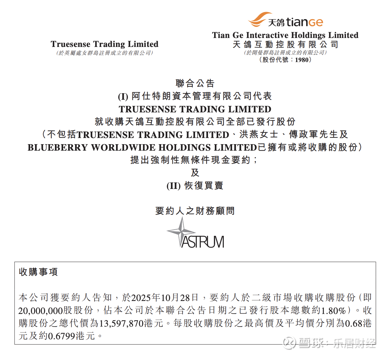 瑞财经 刘治颖近日,天鸽互动(01980)及要约人TruesenseTradingLimited联合公布,于2025年10月28日,要约人于二级市场收购收购股份(即2000万股股份,占公司于本联合公告日期的已发行股本总数约1.80%)。收购股份的总代价为1359.79万港元。每股收购股份的最高价及平均价分别为0.68港元及约0.68港元。