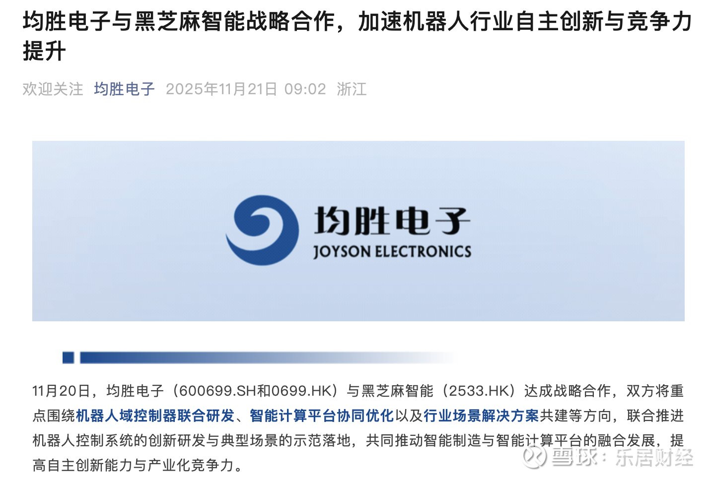 此次,均胜电子与黑芝麻智能将战略合作拓展至机器人领域,双方表示,将充分发挥各自优势,围绕机器人控制器、智能计算平台及行业典型应用场景等重点领域,