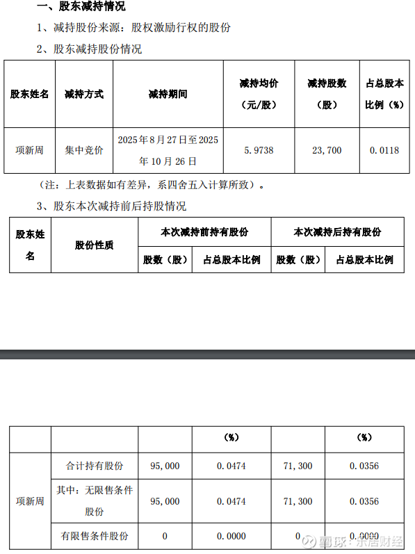 根据公告,10月13日,公司收到项新周出具的《关于股份减持计划实施完成的告知函》,截至本公告披露日,他的减持计划已全部实施完成,减持均价为每股5.9738元,减持股数为23700股。