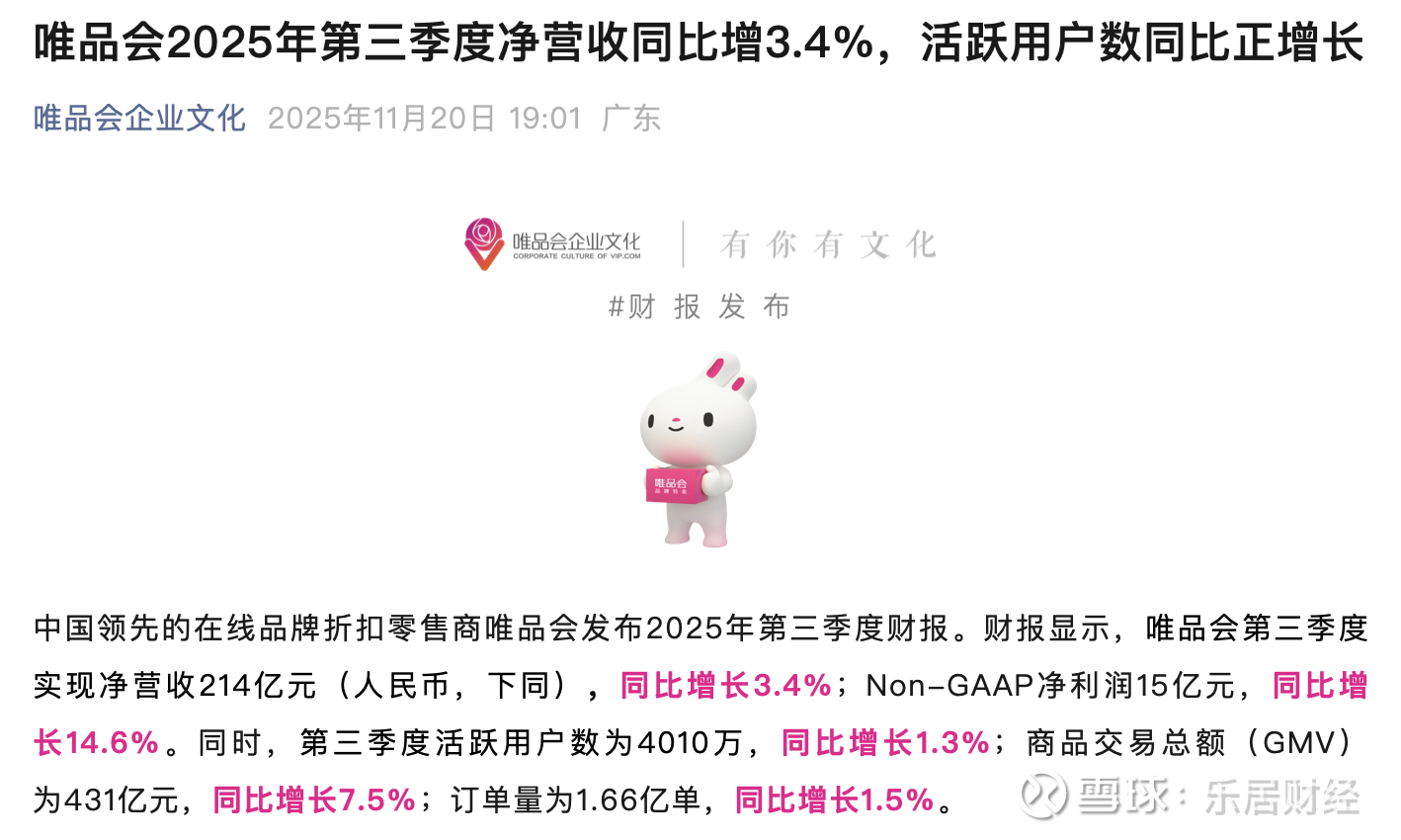 财报显示,唯品会第三季度实现净营收214亿元,同比增长3.4%;Non-GAAP净利润15亿元,同比增长14.6%。