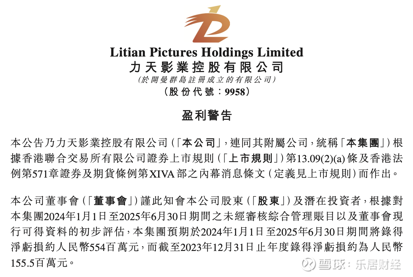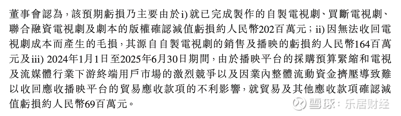 董事会认为,该预期亏损主要由于就已完成制作的自制电视剧、买断电视剧、联合融资电视剧及剧本的版权确认减值亏损约2.02亿元;因无法收回电视剧成本而产生的毛损,其源自自制电视剧的销售及播映的亏损约1.64亿元;2024年1月1日至2025年6月30日期间,由于播映平台的采购预算紧缩和电视及流媒体行业下游终端用户市场的激烈竞争以及因业内整体流动资金挤压导致难以收回应收播映平台的贸易应收款项的不利影响,就贸易及其他应收款项确认减值亏损约6900万元。