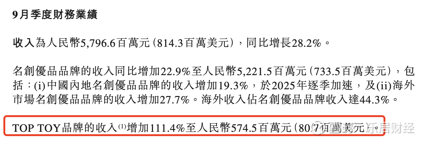 2025年第三季度,名创优品旗下TOP TOY品牌的收入增加111.4%至5.75亿元。2025年前三季度,TOP TOY品牌的收入增加87.9%至13.17亿元。