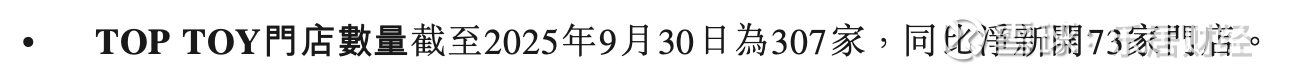 截至2025年9月30日TOP TOY门店数量为307家,同比净新开73家门店。