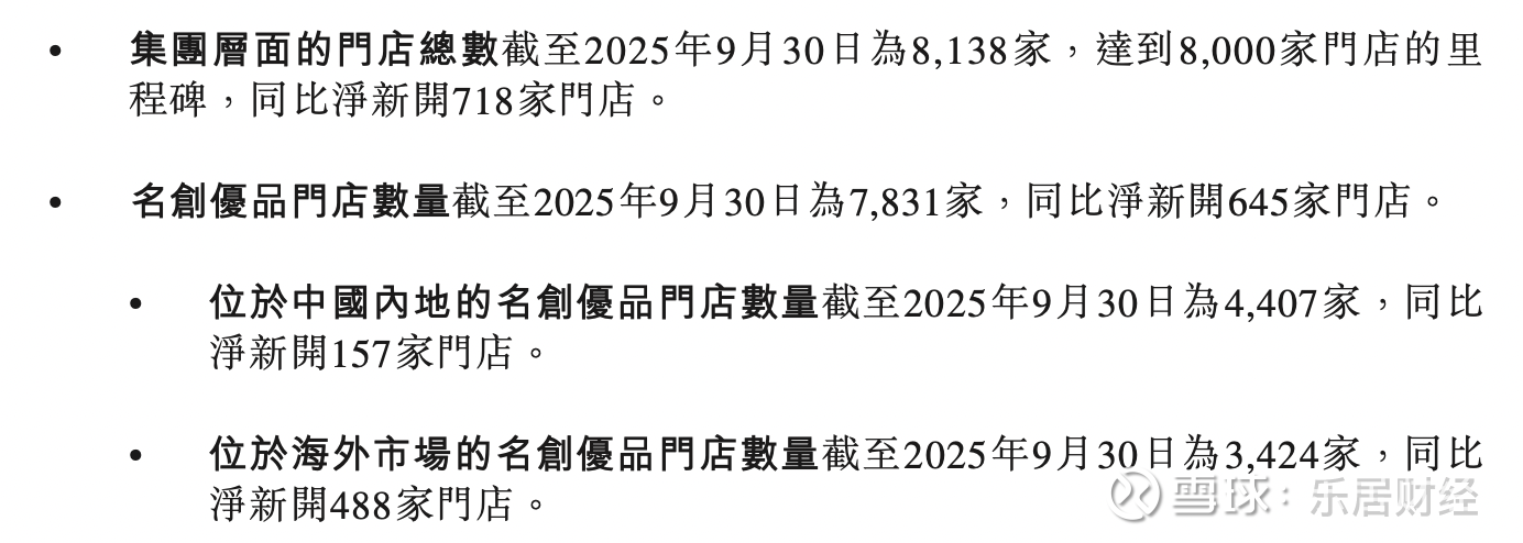 门店方面,集团层面的门店总数截至2025年9月30日为8,138家,达到8,000家门店的里程碑,同比净新开718家门店。