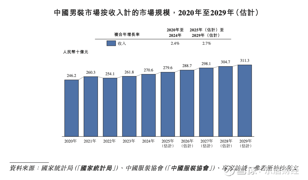 展望2025年至2029年,中国男装市场预计将由2,796亿元持续扩张至3,113亿元,复合年增长率约2.7%,呈现稳健上行态势。这一增长路径主要呈现以下特征:标准化门店运营日益强化、全渠道履约体系持续完善,以及功能性与舒适性属性在大众价格区间的普及渗透。