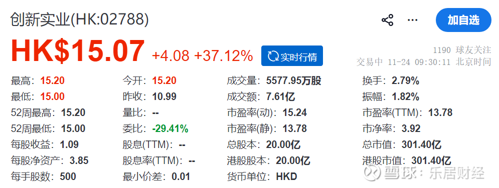 乐居财经 王敏11月24日,创新实业(HK:02788)在港交所挂牌上市,中金公司和华泰国际联席保荐。其开盘涨37%,总市值301.4亿港元。