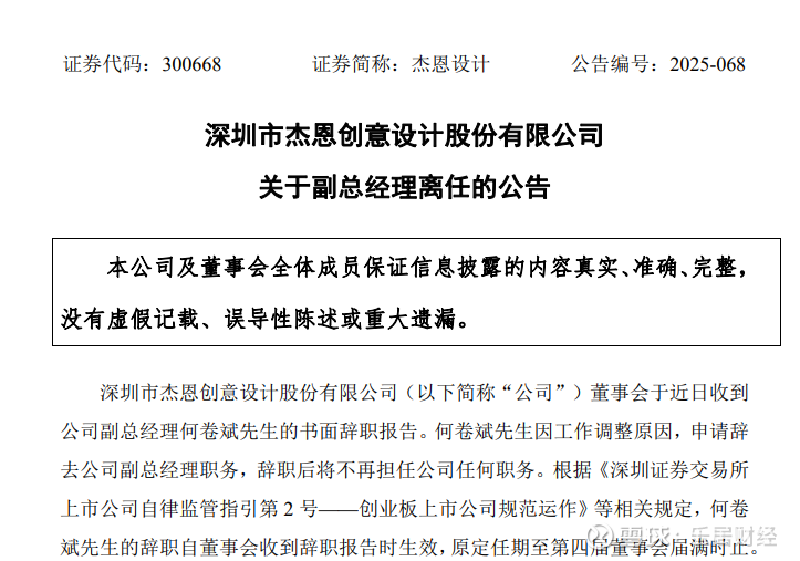 乐居财经 李兰 11月24日,杰恩设计(300668.SZ)发布公告,何卷斌因工作调整原因,申请辞去公司副总经理职务,辞职后将不再担任公司任何职务。