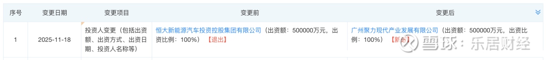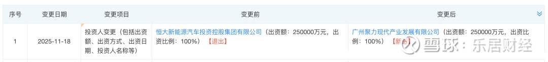 原股东恒大新能源汽车投资控股集团有限公司退出,广州聚力现代产业发展有限公司(下称“广州聚力”)新晋成为控股股东,分别以 25 亿元、50 亿元的出资额,对两家子公司实现 100% 持股。