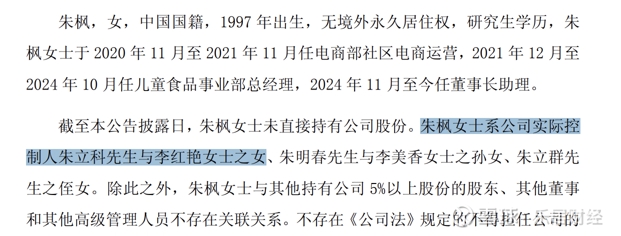 朱枫,女,中国国籍,1997年出生,无境外永久居住权,研究生学历,朱枫于2020年11月至2021年11月任电商部社区电商运营,2021年12月至2024年10月任儿童食品事业部总经理,2024年11月至今任董事长助理。