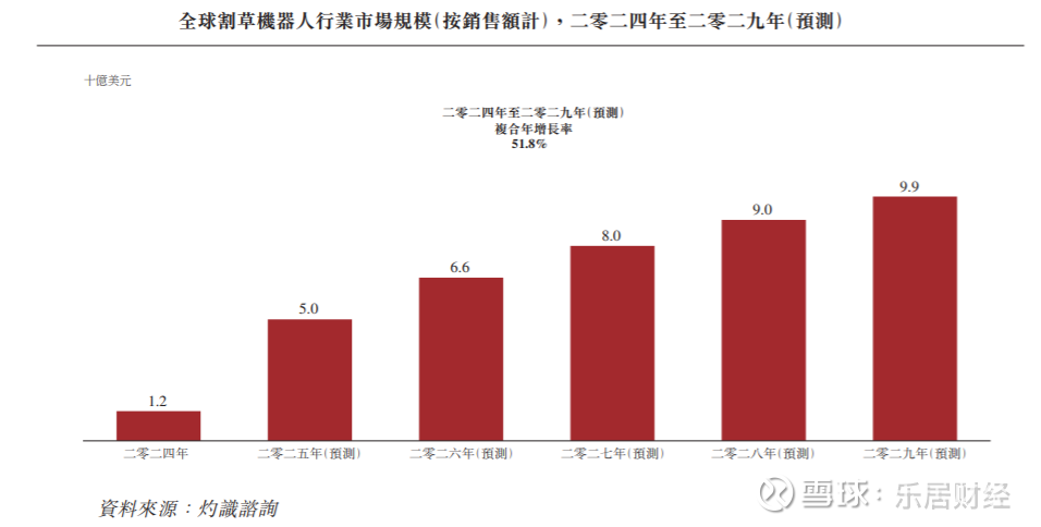 于二零二四年之前,割草机器人市场仍处于商业化的早期阶段。随著技术成熟和产品性能迭代,全球割草机器人渗透率不断提升,市场潜力巨大。市场规模预计将由2024年的12亿美元增长至2029年的99亿美元,而2024年至2029年的复合年增长率为51.8%。