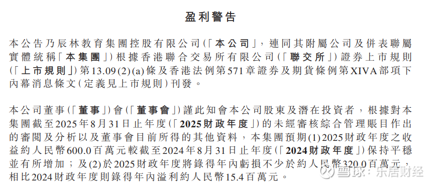 瑞财经 钟鸣辰 11月25日,辰林教育(1593)发布盈利警告,预计2025财年亏损不少于3.2亿元。