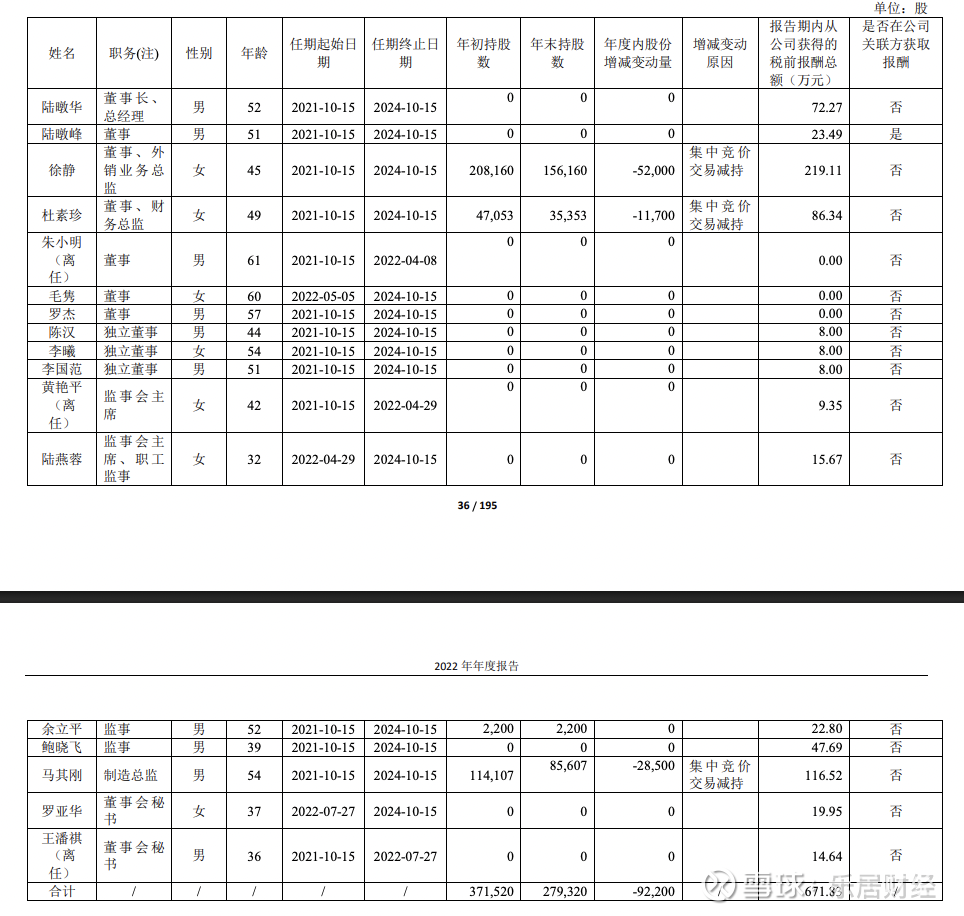 薪酬方面,2022年,牧高笛董监高合计报酬为671.83万元。其中,董事长、总经理陆暾华报酬为72.27万元,董事、外销业务总监徐静报酬为219.11万元,董事、财务总监杜素珍报酬为86.34万元,制造总监马其刚报酬为116.52万元。